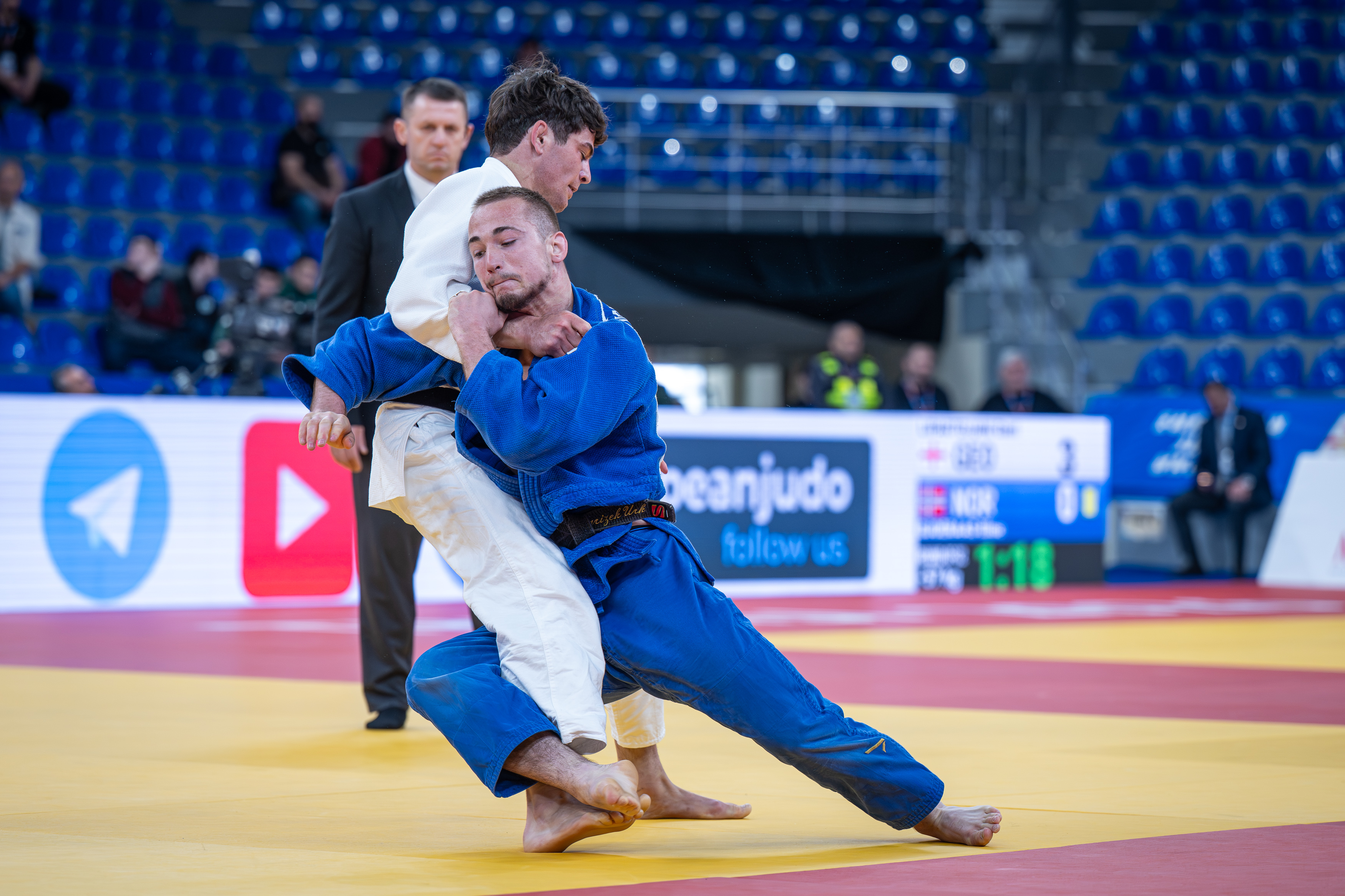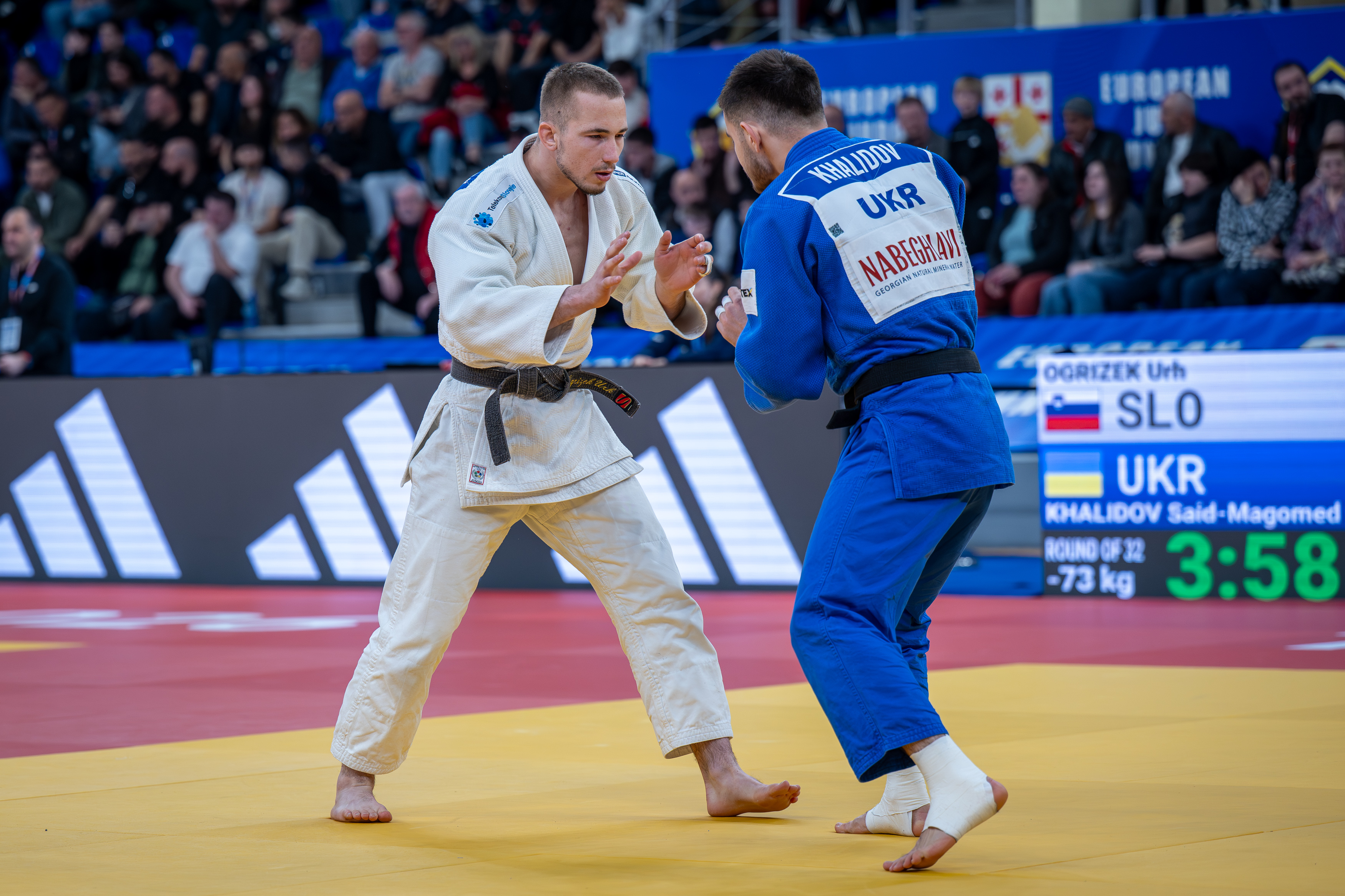 Veliko bolj uspešen začetek je uspel Urhu Ogrizku, ki je na svojem debitantskem članskem evropskem prvenstvu v prvem krogu premagal Bolgara Marka Hristova, bronastega z evropskega prvenstva leta 2022. Izenačeno borbo je odločil vsega 17 sekund pred koncem z učinkovito tehniko ko-uchi-makikomi za yuko.